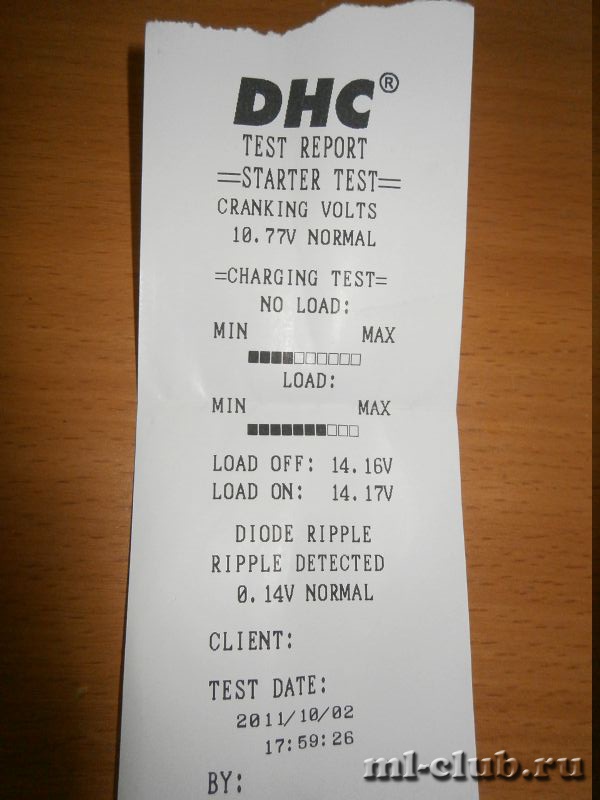 съездил к знакомому в магазин на проверку состояния АКБ чудо тестером. тест дал результат, что осталось 73% ресурса (т.е. нк 100АЧ, а гдето на уровне 70Ач), но плотность показала, что батарейка просто разряжена. сделали комплексный тест (результат в чеке), а потом в гараже уже проверил токовыми клещами - потребление в режиме покоя 0.3-1.2А (буду решать это попозже) и кушает АКБ току аж 17А - голодная она у меня получается всегда((((( надо сделать подзарядку на выходных...